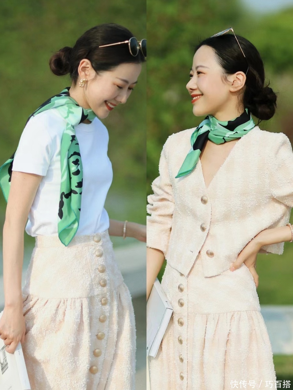 第三大类相宜40+女性学习模仿的是“丝巾”,小小方巾诚然在面积上莫得上风,但关于中年女性来说,短长常统筹兼顾的,有它在的造型会自带儒雅殊效。
