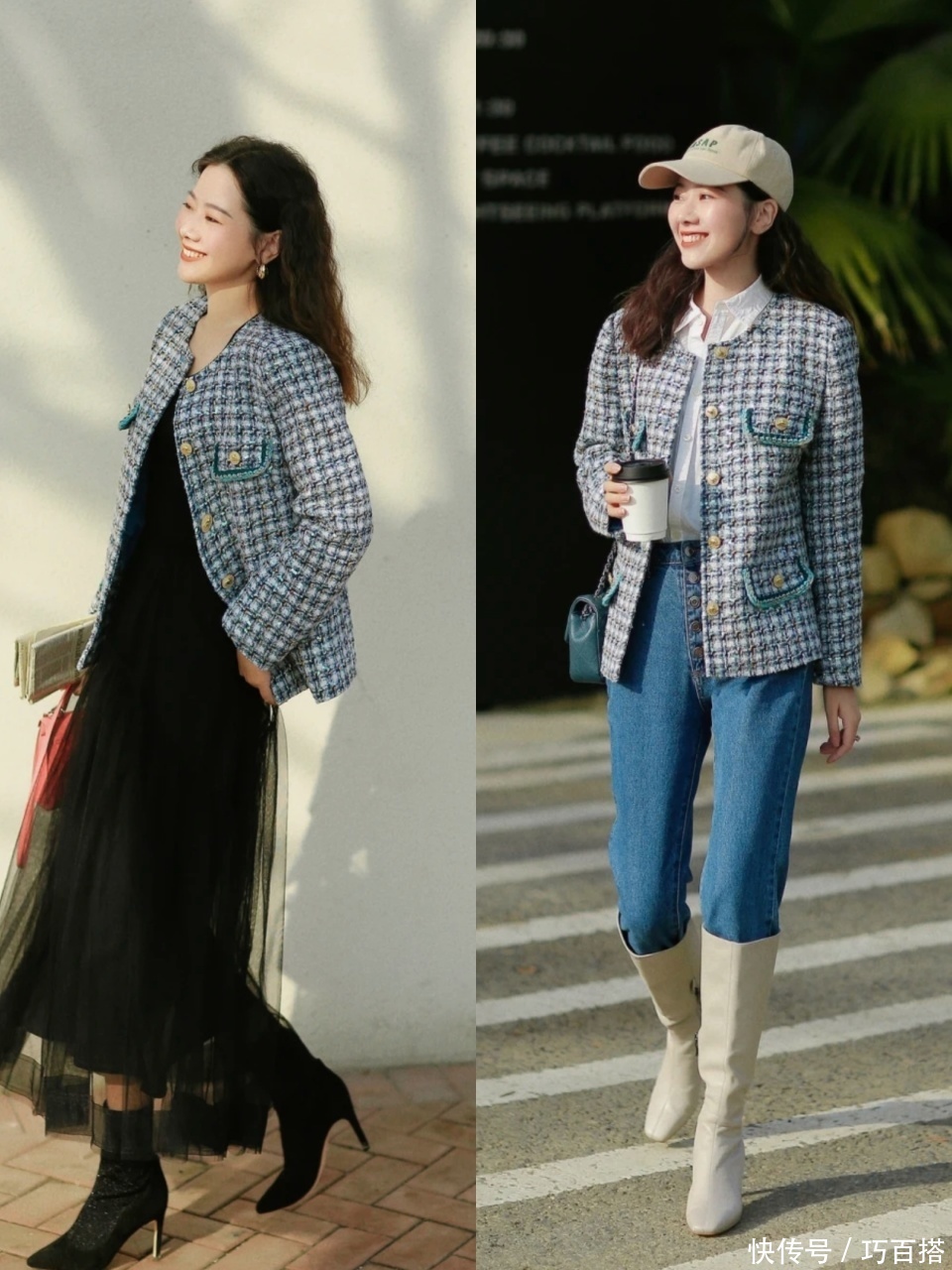 在挑选小香风外衣的版型时,修身无领短款模板,上身效力最nice,单品上身既能遮肉又能增多精气神,高等感满满。