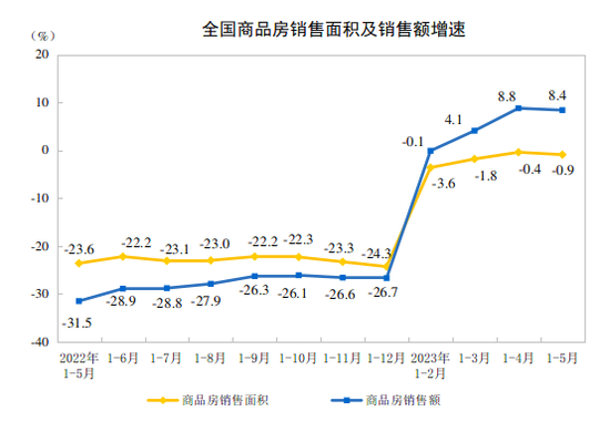 1—5月份,商品房销售面积46440万广阔米,同比下落0.9%,其中住宅销售面积增长2.3%。商品房销售额49787亿元,增长8.4%,其中住宅销售额增长11.9%。